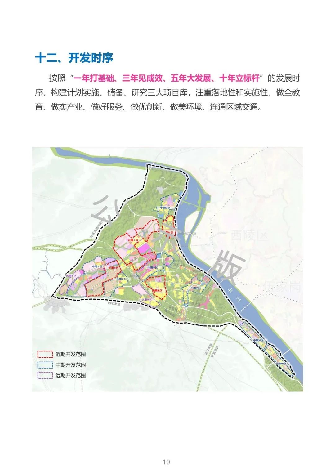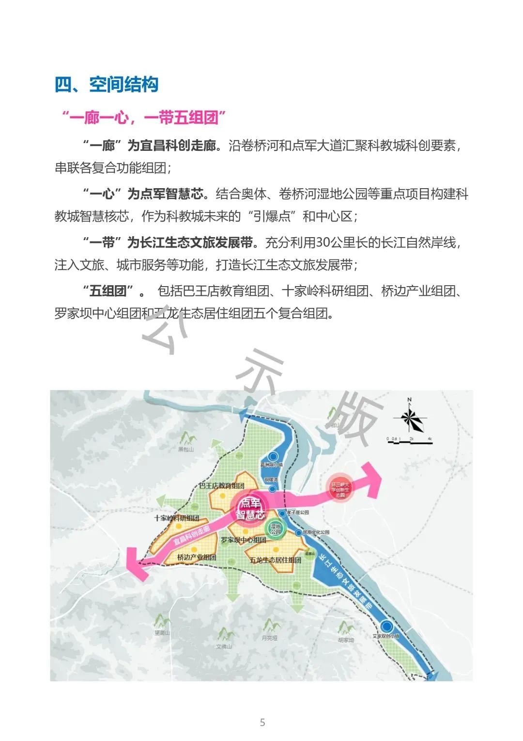 宜昌科教城位于宜昌市点军区,规划范围为翻坝高速、城西高速及长江围合区域,总面积100平方公里。依托点军区优越的区位、产业优势和科教、生态资源,围绕“宜昌产业转型发展新引擎、青年友好生态活力新城区、国家级区域科创新中心、长江经济带科教新高地”的功能定位,规划建设用地规模49平方公里、人口规模40万人,构建了“一廊一心,一带五组团”的空间格局及“一年打基础、三年见成效、五年大发展、十年立标杆”的开发时序,着力将宜昌科教城打造成集生态引领、产城融合、文化支撑、青年友好的“三峡智谷、求索胜地”。
