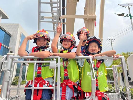 在体验和互动环节,孩子们观看了消防员精彩的技能演示,穿上战斗服,并乘上登高消防车体验高处救援,孩子们不时发出阵阵欢呼声,着实过足了“消防瘾”。