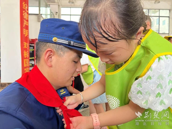 临别之前,消防员为孩子们送上铅笔、尺子等文具用品,孩子们依依不舍的为消防员戴上象征荣誉的红领巾。