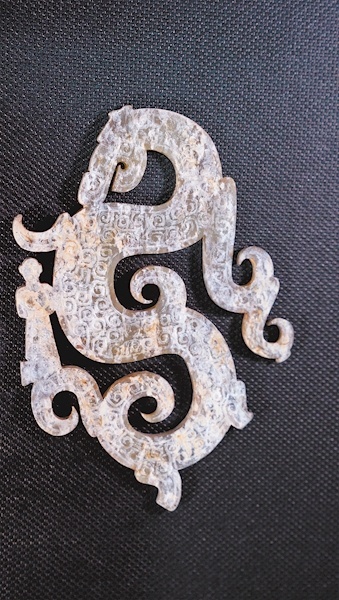 在出土的众多玉器中,神人乘龙形玉佩极具楚文化特色,是寄托死者灵魂飘游升天的祝祷之物。该玉佩透雕为一条盘旋飞舞的龙形,龙尾上倚立一人,双手捧于腹部。艺术造型表现出谲诡精绝的独特风格,透映出楚人对自然生命的孜孜探索和浪漫情怀。