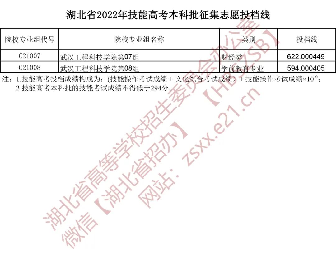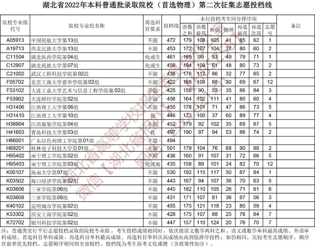 湖北省2022年本科普通批第二次征集志愿、技能高考本科征集志愿投档线