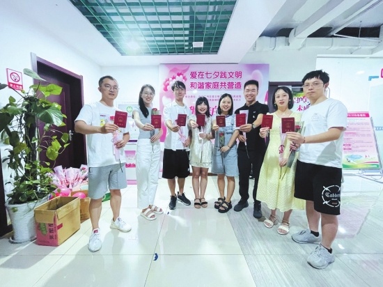 浪漫的“仪式感”在我市多地婚姻登记服务中心同步呈现,各地提前为新人开通七夕婚姻登记预约通道,妆点了婚姻登记场所,引导准新人宣读“结婚誓言”,为新人颁发结婚证、拍照并送上诚挚祝福,进行婚姻家庭辅导、优生优育等主题宣传活动。