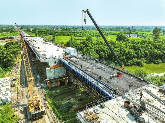 8月4日,在荆州区八岭山镇铜岭岗村荆荆铁路三标段施工现场,工人正在进行七孔道岔连续梁的施工。