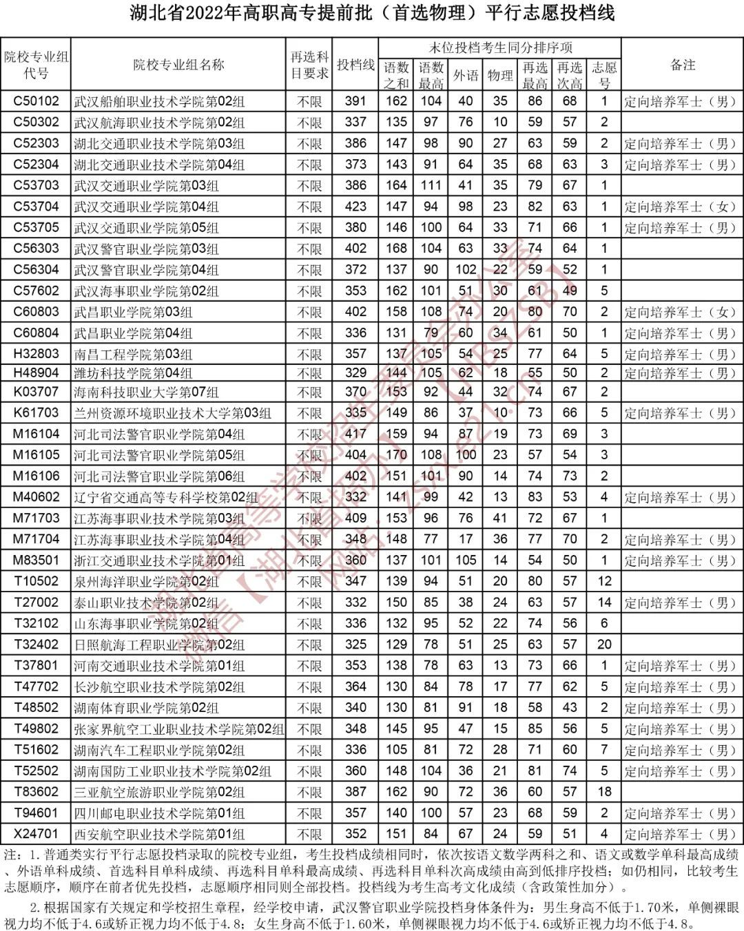 高职高专提前批投档执行高职高专录取批次线,按平行志愿投档规则进行,投档比例为院校专业组招生计划的100%。报考定向培养军士的考生须通过省征兵办组织的体格检查和政治考察且合格,不合格的考生不能参加投档录取。