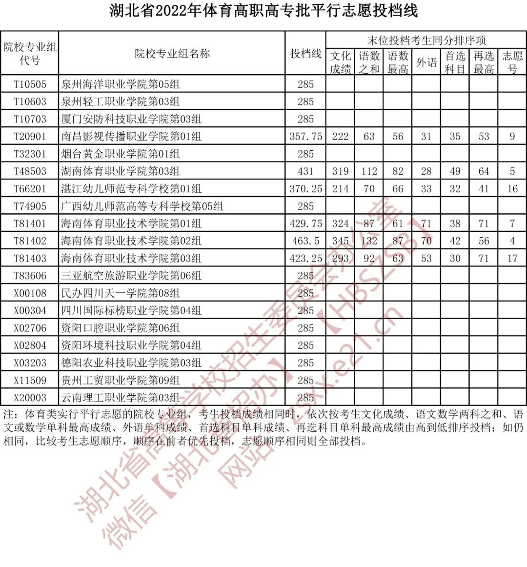 将体育身体素质测试成绩、文化成绩均达到高职高专录取控制分数线的考生,按考生文化成绩的50%与体育身体素质测试成绩的75%之和,从高分到低分排序,按照平行志愿投档规则进行投档。投档比例为招生计划的100%。