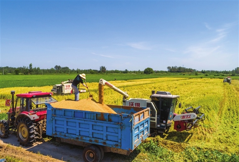 刚刚立秋,中稻正是孕穗期,再生稻迎来丰收季。8月9日上午,杨林尾镇白字村机声隆隆、稻香阵阵,三台收割机在田间欢快穿梭,一串串金黄的稻穗被收割、脱粒。