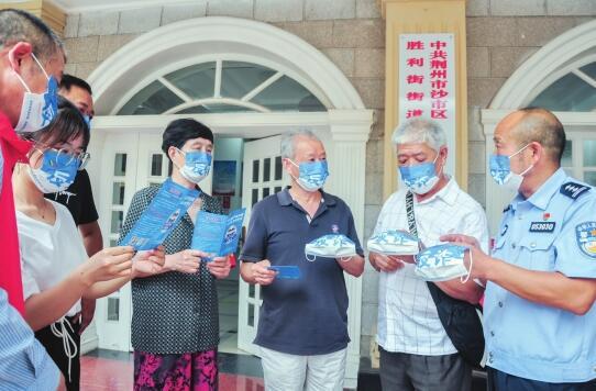 日前,沙市区胜利街道石闸门社区民警向居民介绍“反诈”口罩。