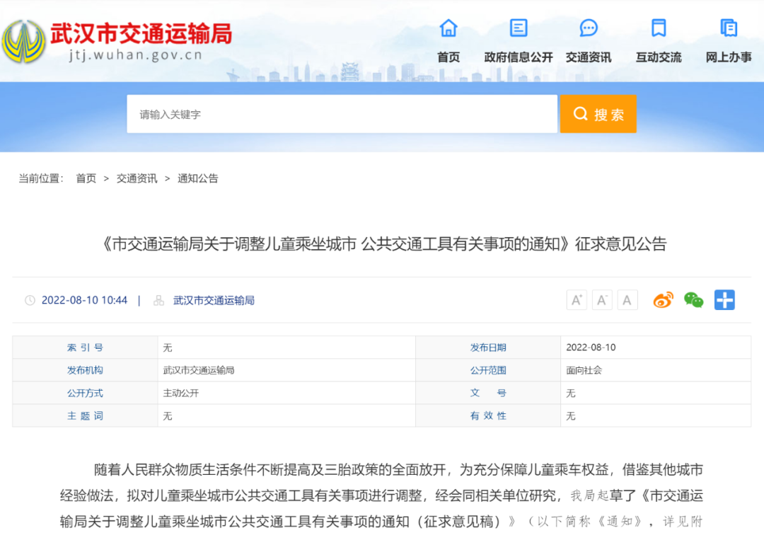 公告指出,随着人民群众物质生活条件不断提高及三胎政策的全面放开,为充分保障儿童乘车权益,借鉴其他城市经验做法,武汉将对儿童乘坐城市公共交通工具有关事项进行调整:
