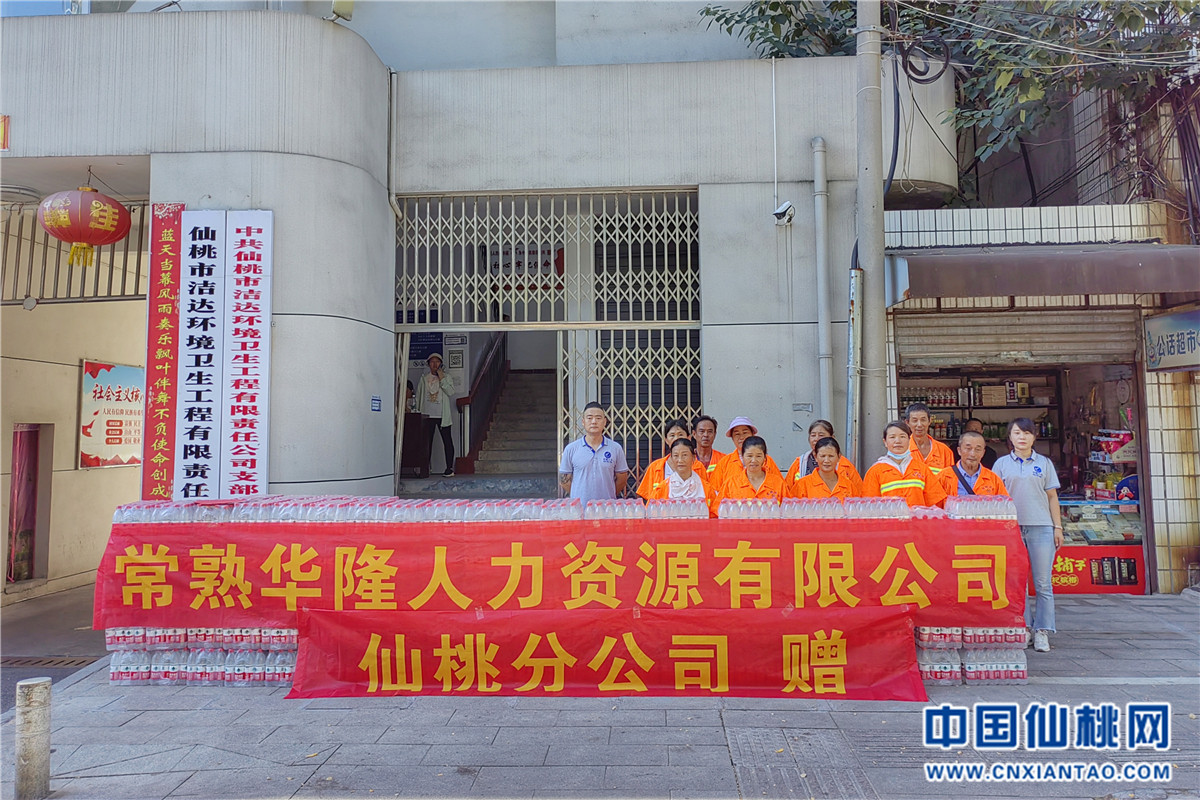 连日来,仙桃市持续高温,环卫工人战酷暑守一线,“汗”卫着城市的干净整洁,一些爱心企业送来夏日清凉。8月10日上午,爱心企业常熟华隆人力资源有限公司仙桃分公司给市环卫局洁达公司的环卫工人送上200箱,共4800瓶矿泉水,为环卫工人送上一份清凉。