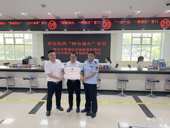 荆楚网(湖北日报网)讯(通讯员 胡保林)“现在有了‘跨市通办’,可就近在鄂城办理营业执照,再也不用两头跑。”8月10日,黄冈市黄州区约涩卫生用品店负责人在鄂州市鄂城区政务服务中心市场准入窗口领取了注册地址在黄冈市黄州区珠明山村的营业执照,这也是鄂城区市场监管局颁发的首张“跨市通办”营业执照。