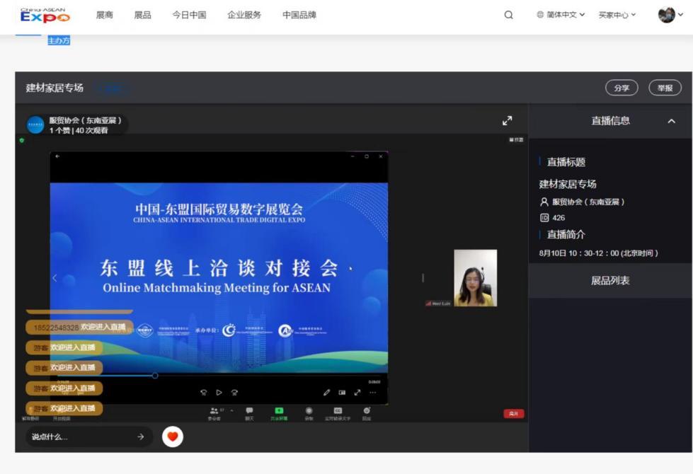 本次线上数字展从8月3日—8月12日(共10天),荆州市贸促会组织11家家居建材类企业参加线上直播对接洽谈,通过前期对行业企业进行摸底调查,专设了荆州专场推介活动,邀请参展商和境外客商进行需求匹配和撮合,帮助企业推动产品升级转型、抢占RCEP东南亚市场、主动融入国际国内双循环。