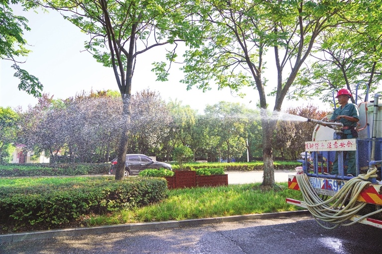 仙桃市园林绿化所相关负责人介绍,连日高温给园林养护工作提出更高要求,为最大限度减少因干旱造成的苗木损失,他们于7月下旬起成立180人抗旱保苗专班,科学制定排班表,采取定人、定车、定责任的方法,督促沔东、沔西、城东、城西、排湖5个养护站做好各项养护工作。“当前,我们主要选择早6时至10时、晚6时至10时两个时间段浇水,避开高温时段既能规避工人中暑,又能有效减少灌溉过程中的水分蒸发,提高浇水养护效果,确保苗木安全度夏。” 该负责人说。(记者 邓一凡 摄影记者 邓娟)