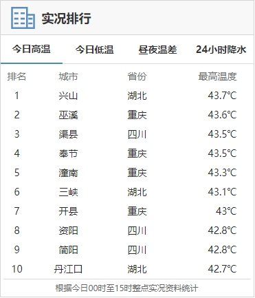 据中国气象局,截至15日15时,湖北3地进入了全国高温榜前十,宜昌兴山更是以43.7℃位居第一。