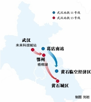 黄石市住建局有关负责人介绍,在对接武汉都市圈同城化发展上,黄石正在谋划轨道交通联网,建设对接鄂州花湖机场轨道交通,串联黄石北站、大冶北站,同时谋划做好武汉地铁11号线延伸至黄石临空经济区的联网事宜;针对武汉地铁13号线未来科技城站向南延伸至鄂州梧桐湖,黄石在谋划将该规划通过轨道并网再延伸至黄石城区,实现武汉、黄石、鄂州城市轨道交通的互联互通。