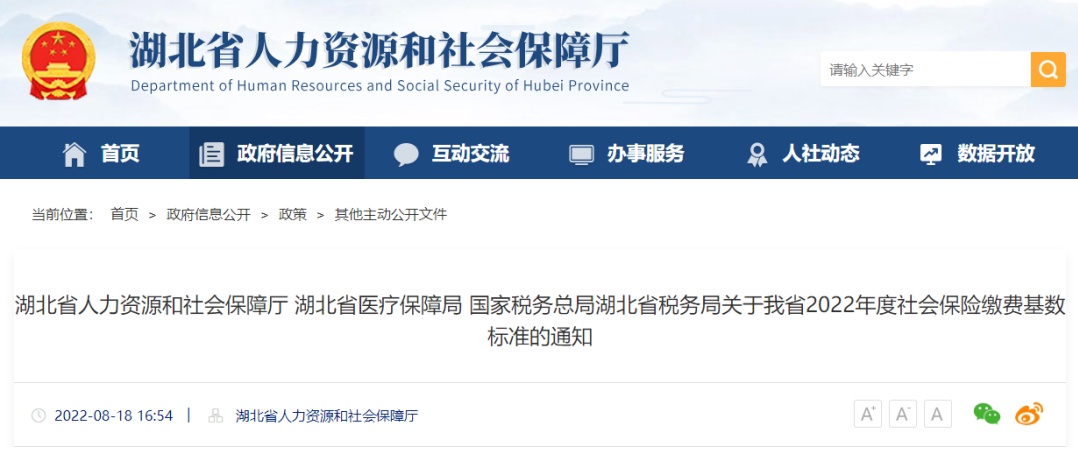 18日,湖北省人力资源和社会保障厅官方网站发布通知,公布了我省2022年度社会保险缴费基数标准。