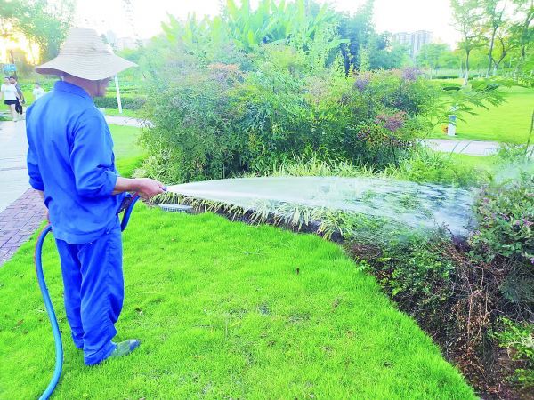 连日来,市城市公园管理处每天投入近100名园林工人,分时段对各公园、广场绿植进行喷水浇灌,确保园林植物在持续晴热天气下健康生长。通讯员 徐薇 摄