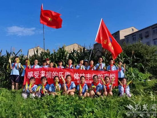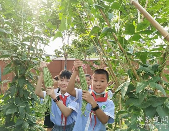 顶着炎炎烈日,闻着泥土的芬芳。鄂州市葛店实验四年级学生在老师、家长的带领下走出“空调房”,到田间地头开展蔬果采摘活动。只见孩子们伸起胳膊,踮起脚,仰着脸,小心翼翼地从藤蔓上摘下茄子、辣椒、西红柿、豆角、大葱、黄瓜等新鲜蔬果,不一会儿,手中的盆、桶就装得满满当当,大家惊喜地欢呼着,个个像凯旋的战士。