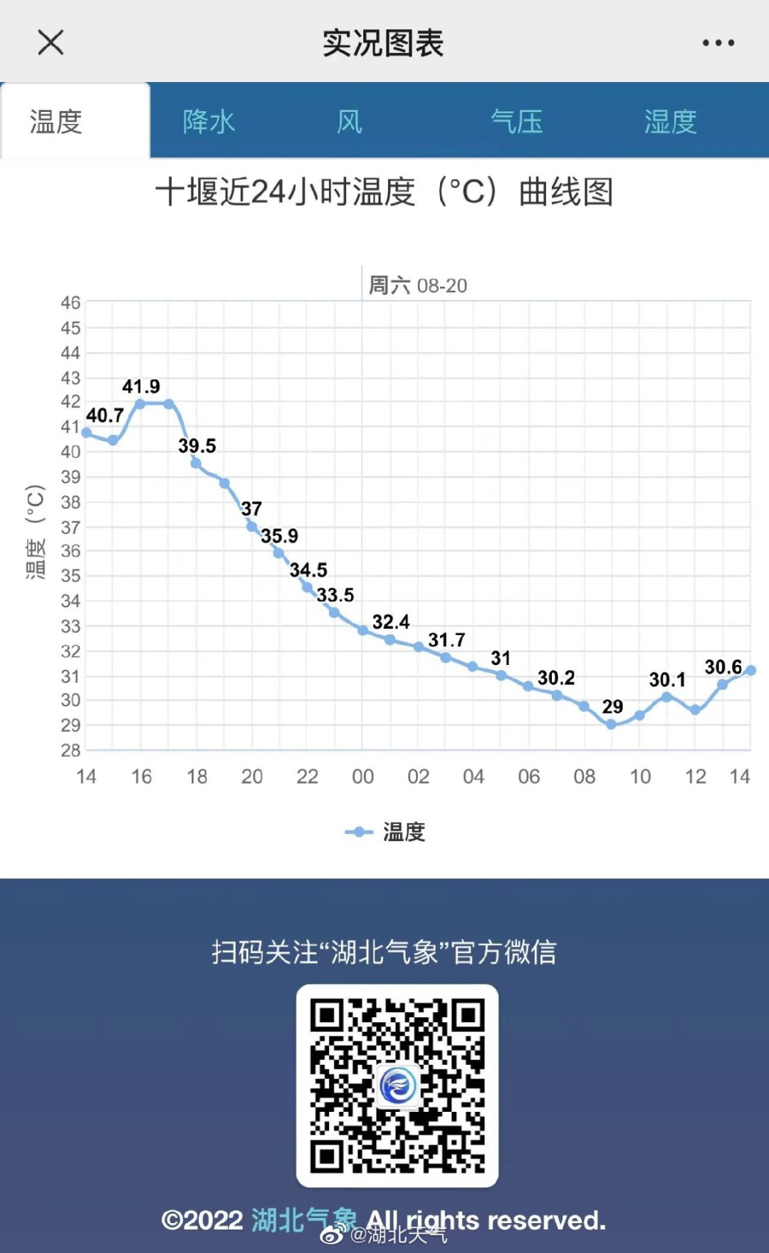 预计未来三天,受副热带高压控制,湖北晴热高温天气持续,最高气温大部地区39~41℃,局部42~44℃。最低气温除恩施地区略低外,其他大部地区都在30℃上下,昼夜高温不停歇。另外,今天午后西部、北部局部有阵雨或雷阵雨出现。