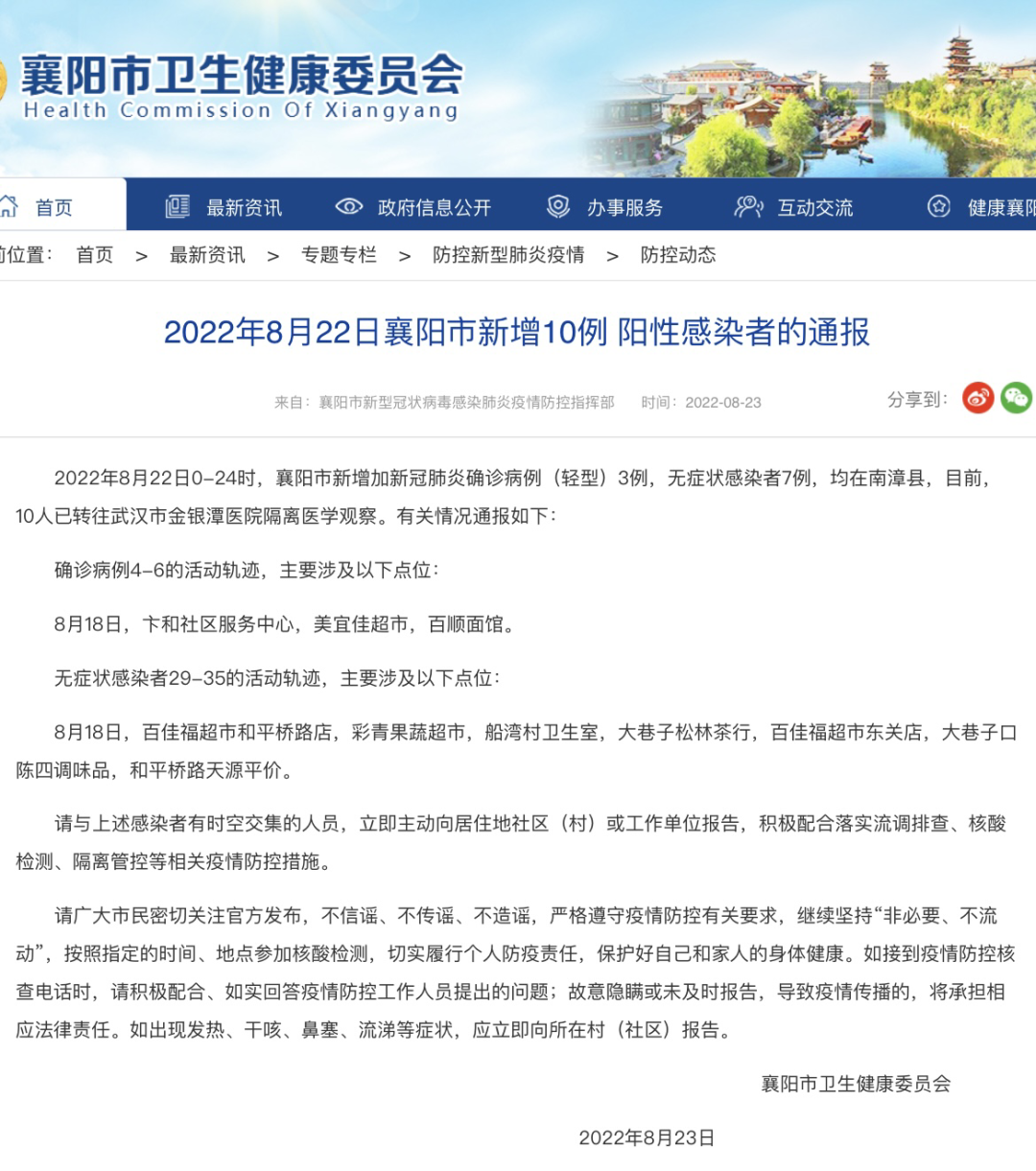 2022年8月22日0-24时,襄阳市新增加新冠肺炎确诊病例(轻型)3例,无症状感染者7例,均在南漳县,目前,10人已转往武汉市金银潭医院隔离医学观察。有关情况通报如下: