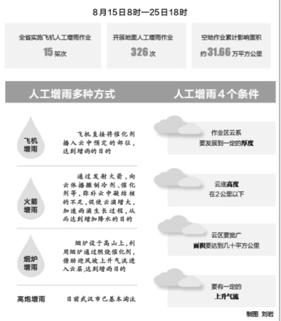 据了解,从8月15日8时至25日18时,全省实施飞机人工增雨作业15架次,累计飞行时长37.54小时;开展地面人工增雨作业326次,空地作业累计影响面积约31.66万平方公里。在天气系统和人工增雨作业共同影响下,十堰、襄阳、恩施、宜昌、神农架、荆门、随州、孝感、黄冈、黄石、武汉、鄂州、咸宁13市州共1640站出现降雨,其中有701站雨量超过10毫米,334站超过25毫米,有106站达到50毫米以上,6站超100毫米,降雨主要集中在十堰、神农架、襄阳、随州、黄冈、宜昌、咸宁等地。