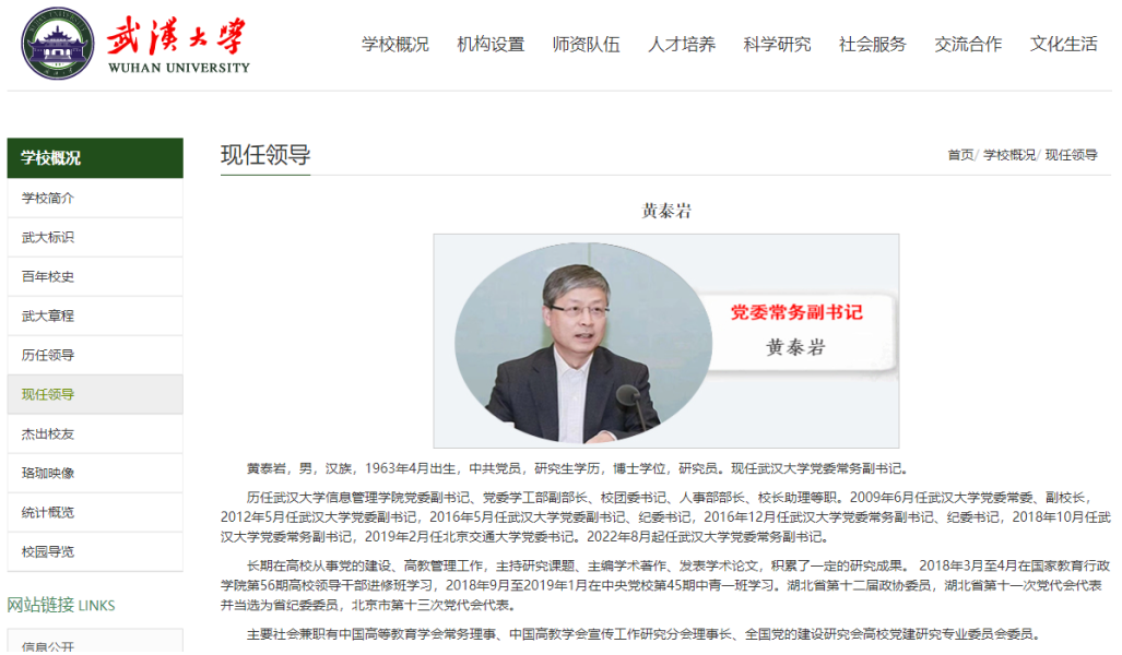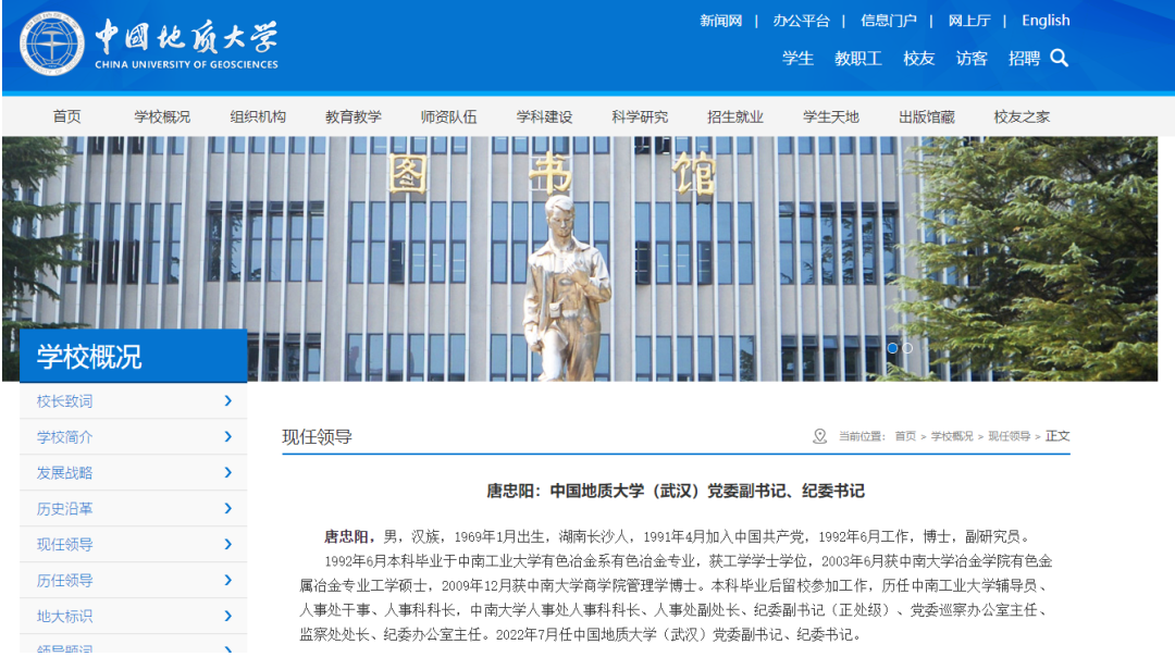 近日,武汉大学、中国地质大学(武汉)领导班子进行调整。记者浏览两校官方网站获悉,黄泰岩已任武汉大学党委常务副书记。唐忠阳同志任中共中国地质大学(武汉)委员会委员、常委、副书记、纪律检查委员会书记。