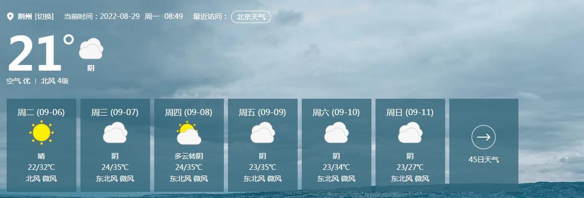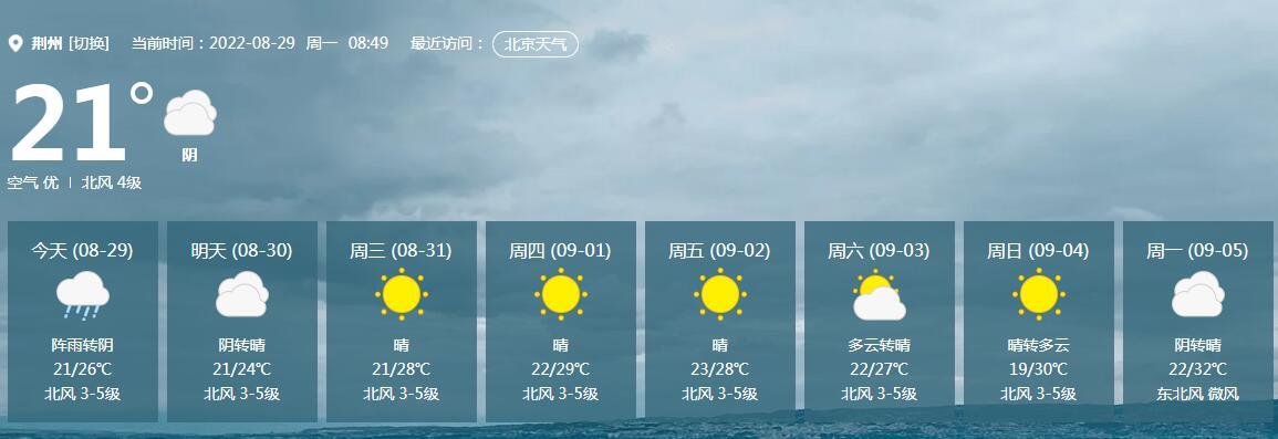 根据气象部门最新天气预报,今明(29日、30日)两天,受冷空气南下影响,荆州最高气温将降至“2”字开头,30日最高气温仅24℃。