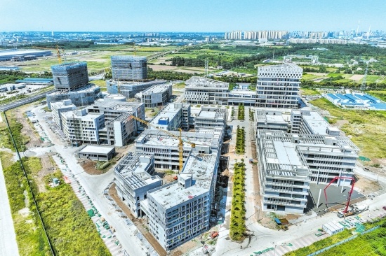 8月25日,在上海大道与江津东路交汇处,无人机俯瞰荆州岑河金色童年小镇科创园项目一期建设现场,楼体外部防护网大部分已经撤除,内部施工稳步进行。