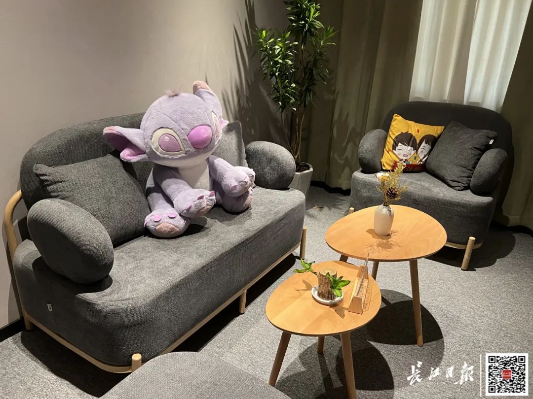 板凳上的毛绒玩偶为室内增添不少趣味。见习记者栾嘉雯 摄