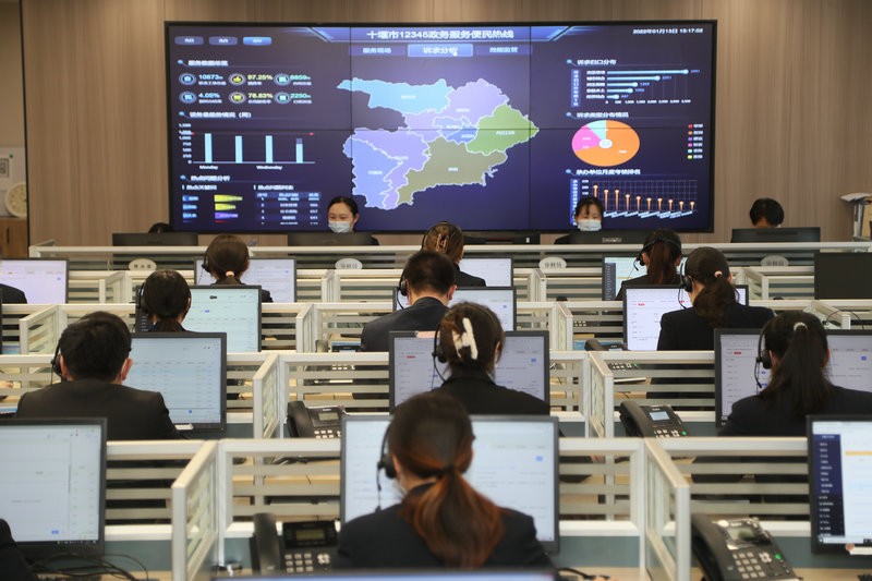 十堰12345政务服务便民热线大厅,工作人员接听并记录市民来电