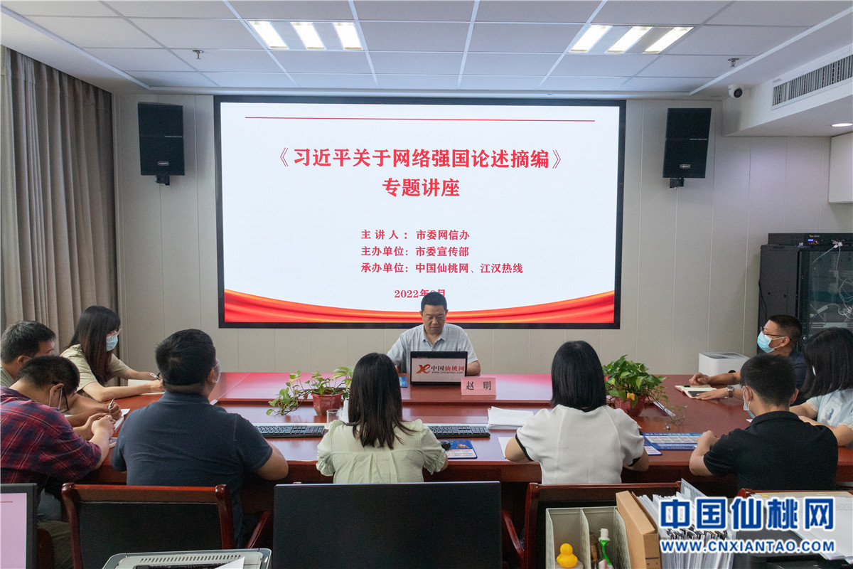 8月29日,中国仙桃网举办“习近平新时代中国特色社会主义思想进网站”宣讲活动,邀请市委网信办理论宣讲小分队成员、市委网信办干部赵明专题宣讲《习近平关于网络强国论述摘编》,中国仙桃网全体从业人员、江汉热线部分从业人员参加学习。