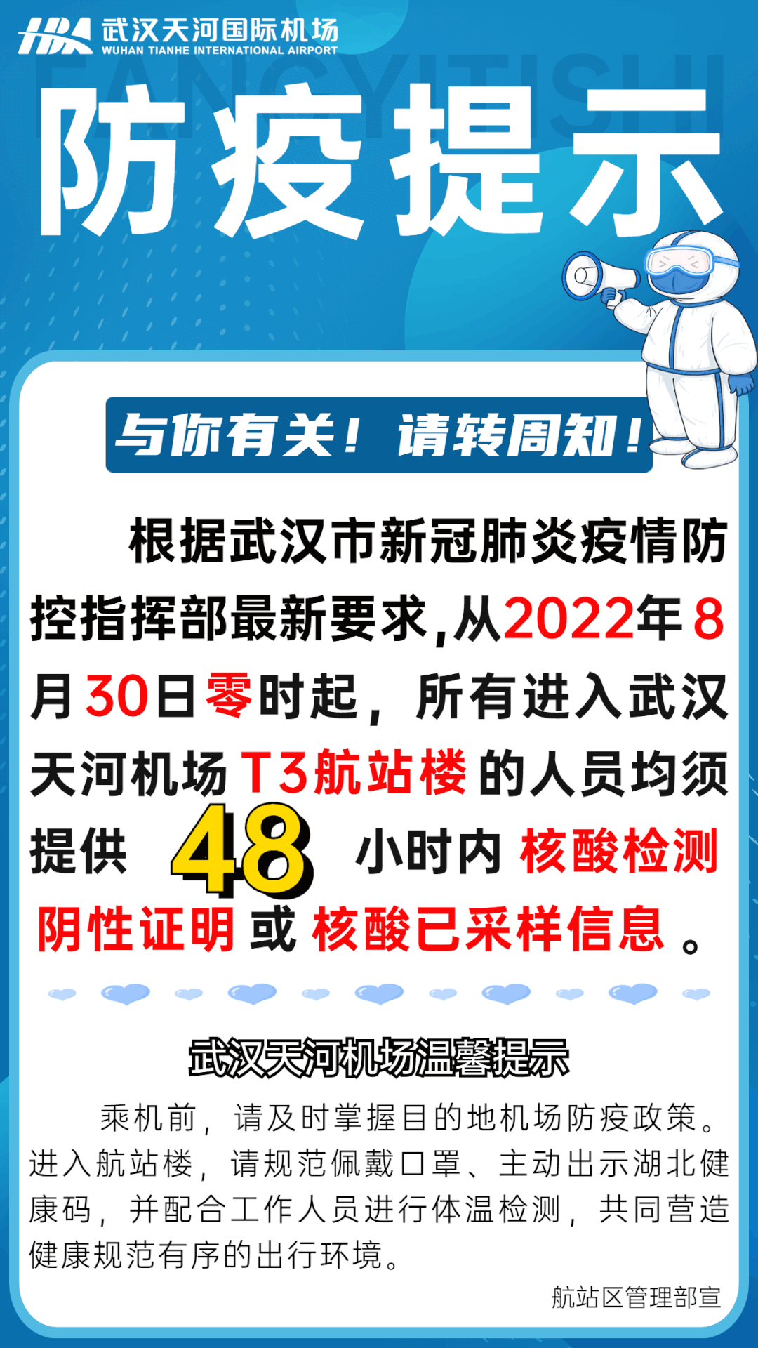 8月30日,武汉天河国际机场发布防疫提示,全文如下: