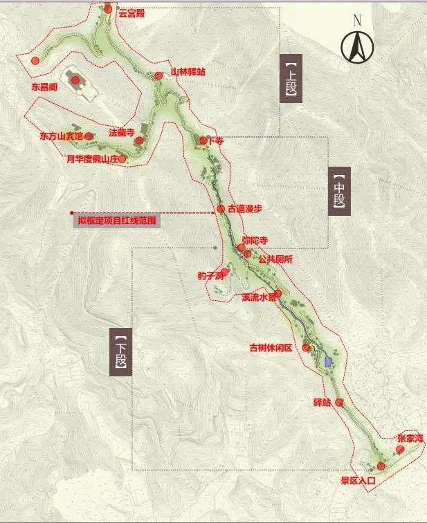 其中,东方山特色文旅一期项目拟投入建设资金1800万元。分三段建设,上段2.3公里,法藏寺到中峰古刹道路提档升级,实施道路拓宽、路面刷黑、排水设施建设,预计投入资金550万元;中段0.5公里,张家湾豹子洞至中峰古刹登山步道升级及景观步道建设,预计投入资金600万元;下段1.7公里,张家湾豹子洞至栗山路区间实施道路拓宽、路面刷黑、溪流水景整体改造升级及景观节点配套服务设施建设,预计投入资金650万元。