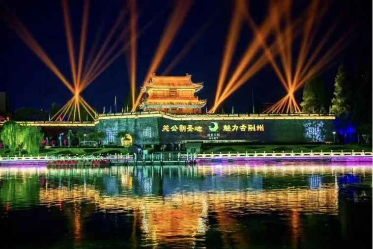 荆州古城东门景区光影秀表演,以水流为舞台、以城墙为荧幕,以灯光为载体,诠释了荆州独有的城市品牌和文化内涵。