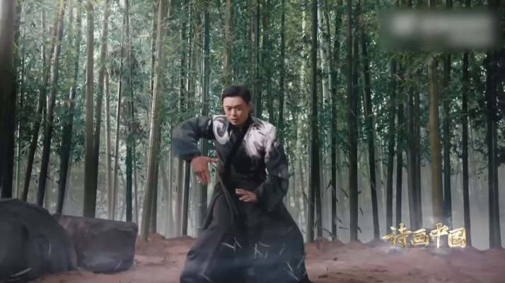 当中国武术与竹石精神“不谋而合”,樊少皇和杨德战身着水墨长衫,一剑一拳、一刚一柔诠释竹石“千磨万击还坚劲,任尔东西南北风”的坚韧不屈。古琴曲《醉渔唱晚》的融入,更为风、竹、石的碰撞增添豪侠之气。