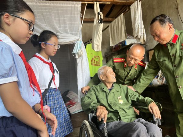 当天上午,志愿队一行人来到东宝区石桥驿镇象河村,看望97岁抗战老兵覃广清。志愿队为老兵送去米、油、月饼等慰问品,并代表市关爱退役军人协会送上慰问金和一辆新轮椅。覃广清非常感动,在和大家交流中分享了自己当年的抗战故事。