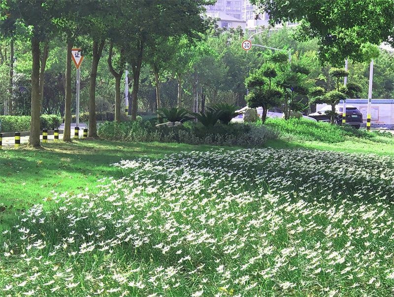 848平方米的河滨路口袋公园曾存在反坡、缺乏景观效果等不足,在建设时增建微地形,栽植景观树种,与相邻的荆襄河湿地公园做好绿化景观衔接。如今河滨路口袋公园绿树葱郁,草坪上铺满了盛放的葱兰花。