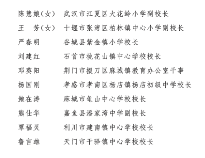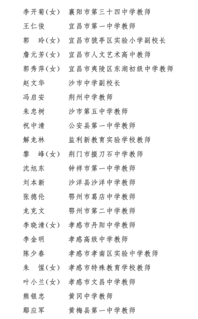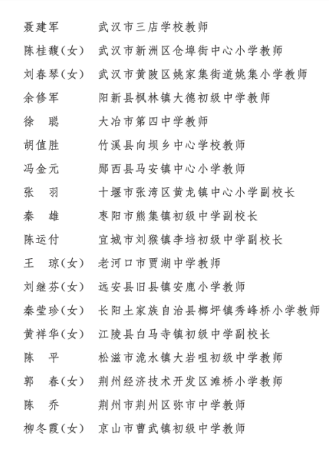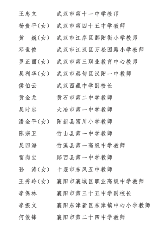 近年来,全省广大教师和教育工作者坚持以习近平新时代中国特色社会主义思想为指导,认真学习贯彻党的十九大及十九届历次全会精神,贯彻党的教育方针,全面落实立德树人根本任务,涌现出了一大批先进个人。为弘扬尊师重教的良好风尚,进一步增强广大教师、教育工作者的荣誉感和责任感,建设高素质教师队伍和教育管理干部队伍,省人民政府决定,授予王忠文等80人第四届“楚天园丁奖”称号,授予聂建军等40人“湖北省农村先进教师”称号,授予陈慧娘等10人“湖北省农村先进教育工作者”称号。
