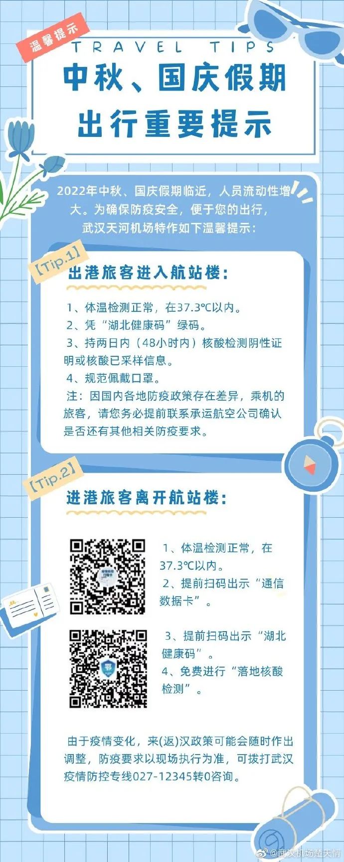 9月9日,武汉天河机场有限责任公司官方微博发布中秋、国庆假期出行重要提示 ,全文如下: