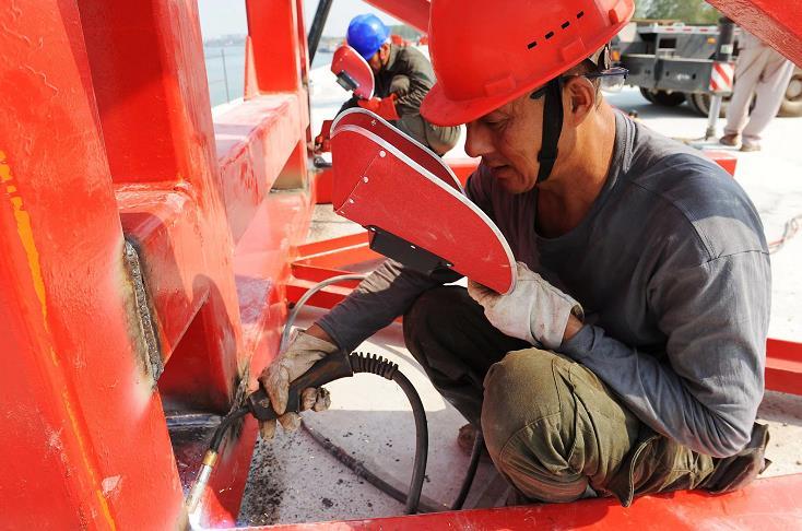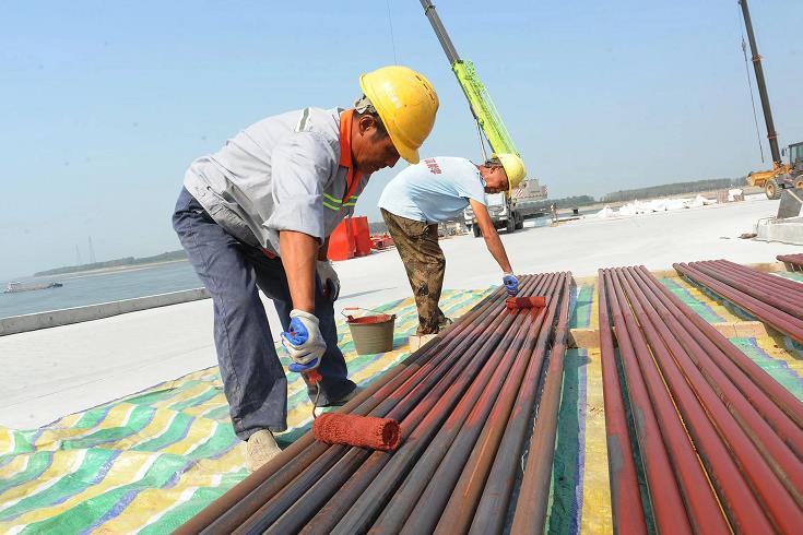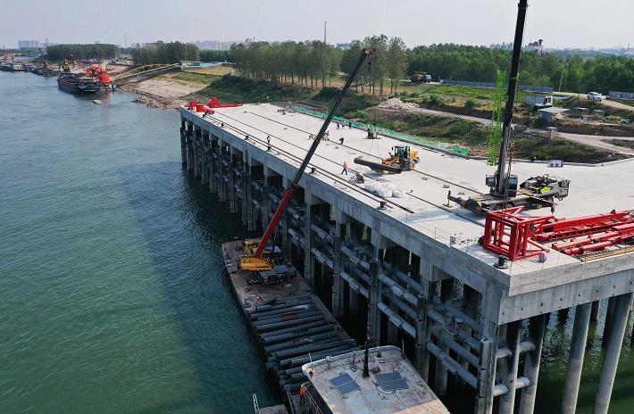 9月12日,荆州开发区木沉渊工业综合码头建设整体结构已基本完工,123根立柱全部安装到位,107米长的平台初现雏形,工人己转入到江边安装船舶防撞设施。