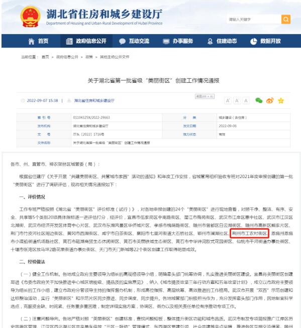 近日,湖北省住房和城乡建设厅公布《关于湖北省第一批省级“美丽街区”创建工作情况通报》,沙市区胜利街道工农村社区成功创建成为湖北省首批22个省级“美丽街区”示范点之一,也是荆州唯一入选街区。