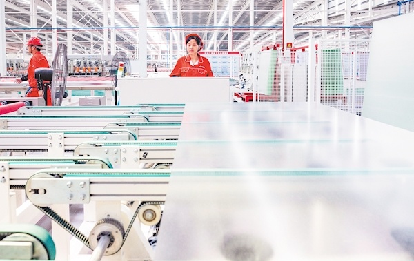 9月7日,荆州经济开发区,员工在湖北亿钧耀能新材股份公司智能化生产线上赶制光伏玻璃。这家省级专精特新“小巨人”企业,从传统玻璃到特种节能玻璃、再到光伏新材料,不断延伸产业链发展链条。目前,该公司投资40余亿元打造的光伏新材产业园,一期已投产,二期正在进行收尾施工。(记者 薛婷 通讯员 张梦瑶 摄)