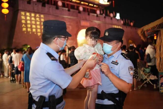 10日晚8点,在方特东方神画景区内,一名小女孩和家人走散,遇上正在巡逻执勤的文旅区分局民警,警察叔叔立马化身暖心“奶爸”,一边抱起小女孩安抚其情绪,一边把走失小孩的照片发到工作群内,联合方特工作人员用广播喊话的方式共同寻找,不到十分钟,顺利找到小女孩家人。