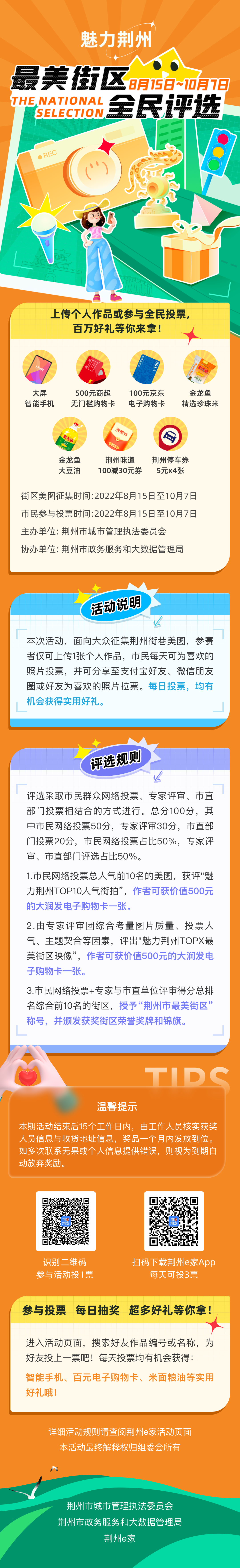 一砖一瓦显楚韵,一镇一街出美景。此次活动公开面向荆州市民征集荆州全市街区美图,市民可以自己拍摄展现荆州街巷“人文之美、景观之美、生活之美、活力之美”的照片,通过“荆州e家”APP参与“魅力荆州·最美街区”全民评选活动线上投票和有奖评选活动。