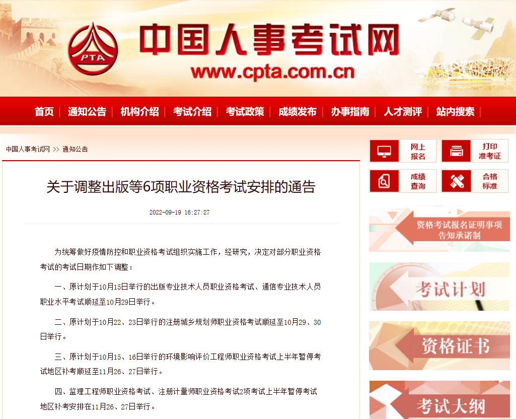 原计划于10月15日举行的出版专业技术人员职业资格考试、通信专业技术人员职业水平考试顺延至10月29日举行。