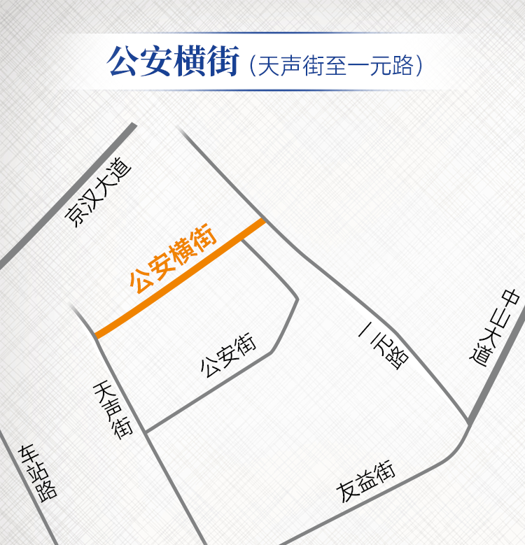 2022年9月30日至2022年11月15日,武汉市江岸区公安横街将进行排水管改造工程施工。该路段施工期间,每日00:00至5:00,公安横街(天声街至一元路)禁止机动车通行。
