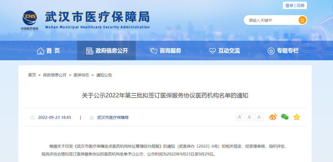 日前武汉市医疗保障局官网发布《关于公示2022年第三批拟签订医保服务协议医药机构名单的通知》