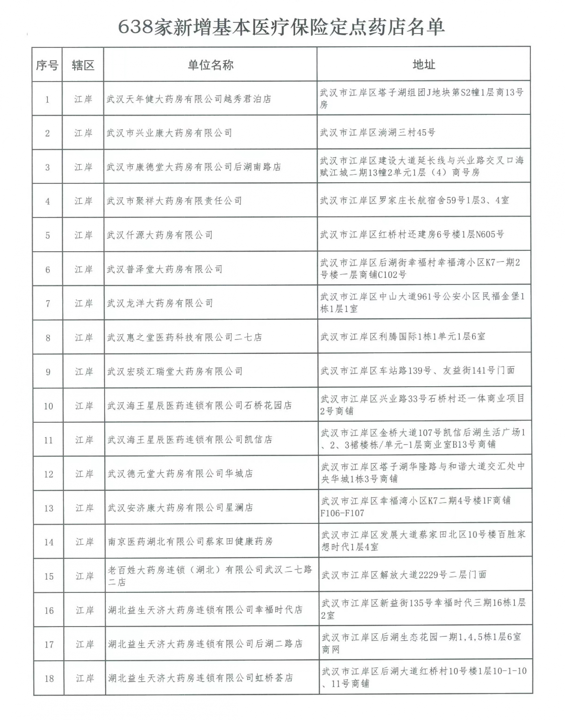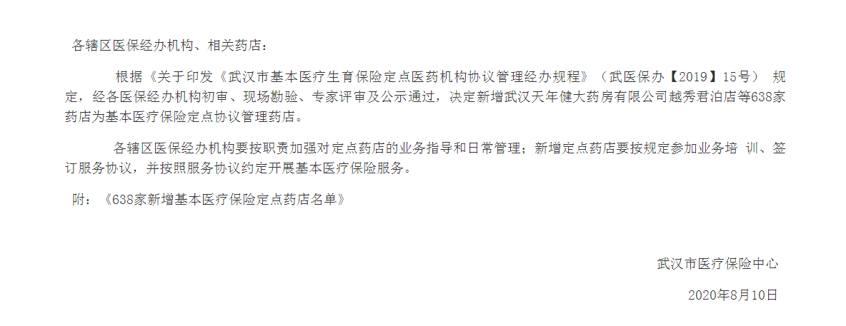 另外,武汉市医疗保障局官网还公布了638家新增基本医疗保险定点药店名单。