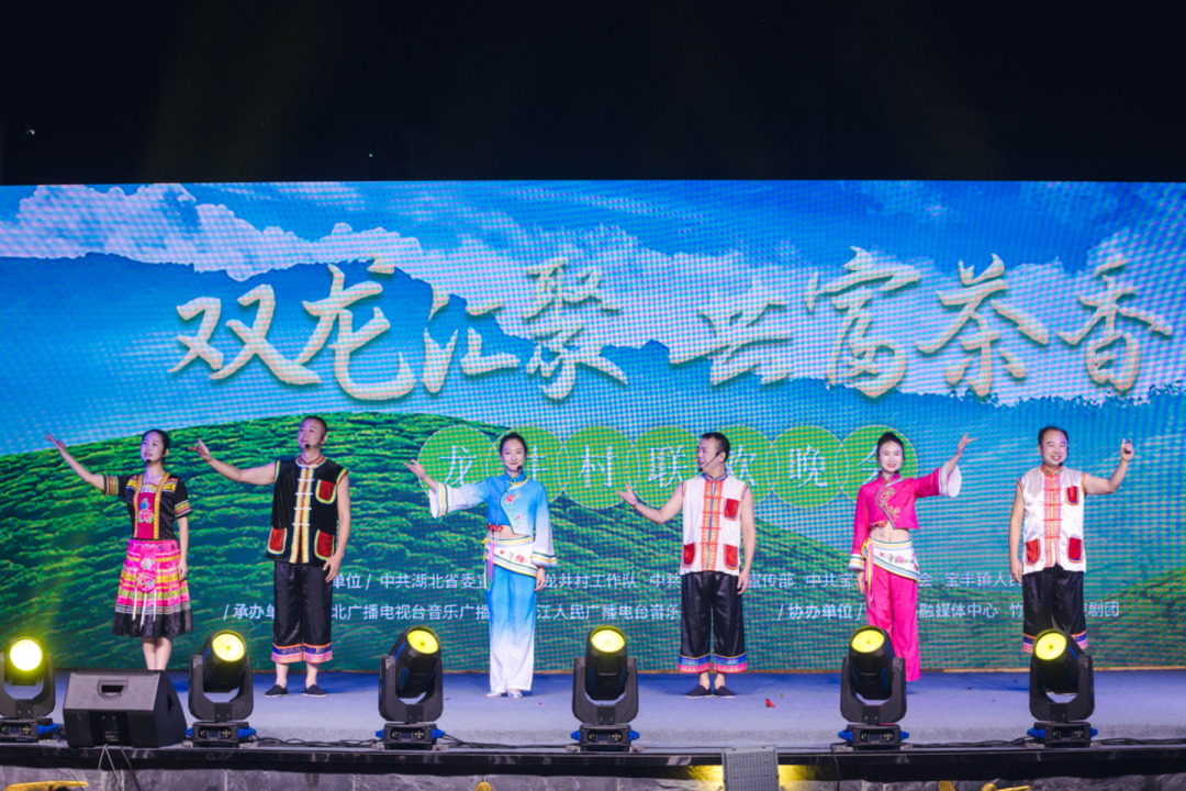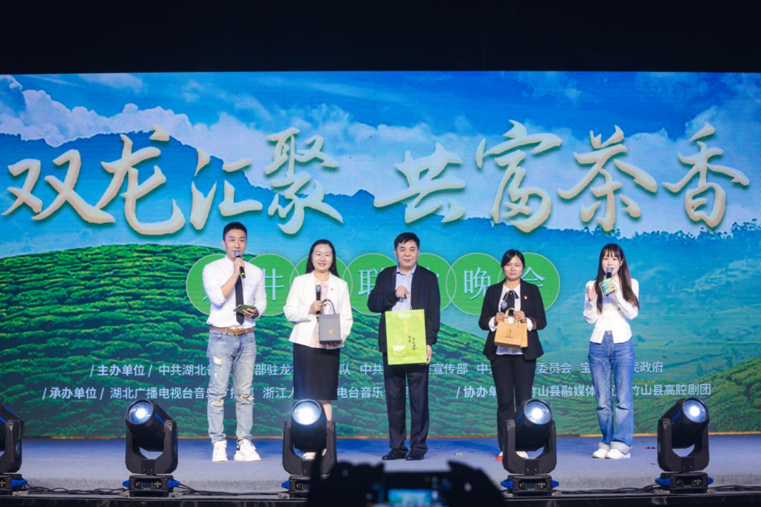 晚会现场,来自杭州西湖龙井村和十堰宝丰龙井村的书记互赠茶叶,相约共同发展,共同进步。