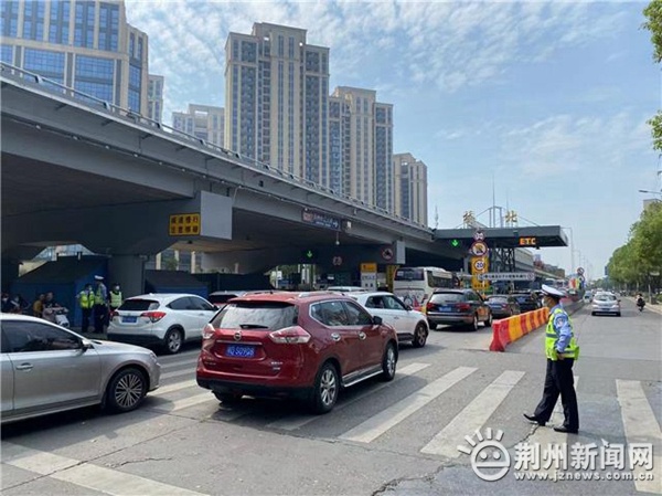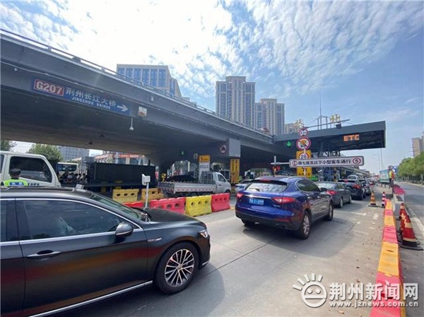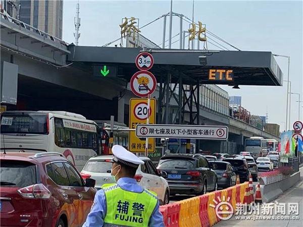 上午10点,在荆州长江大桥桥北收费站上桥处,车辆通行缓慢,出现了一定程度的拥堵,值守民警在此指挥,提醒车辆耐心等待,省高警公安大队民警介绍,二广高速荆州长江大桥段日均车流量为3万台次左右,预计今天的车流量会达到8万台次左右。