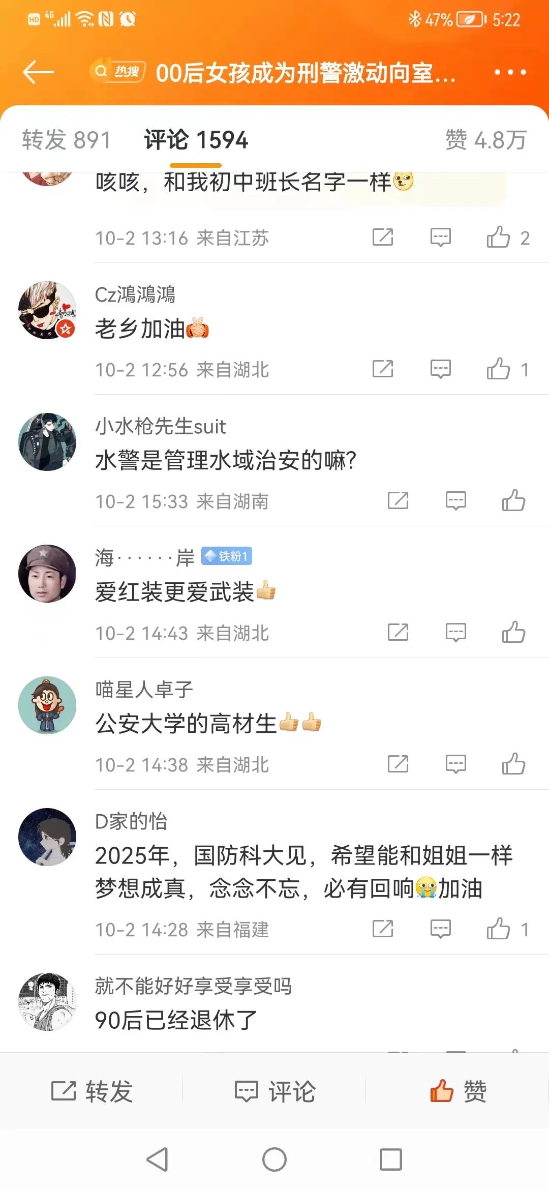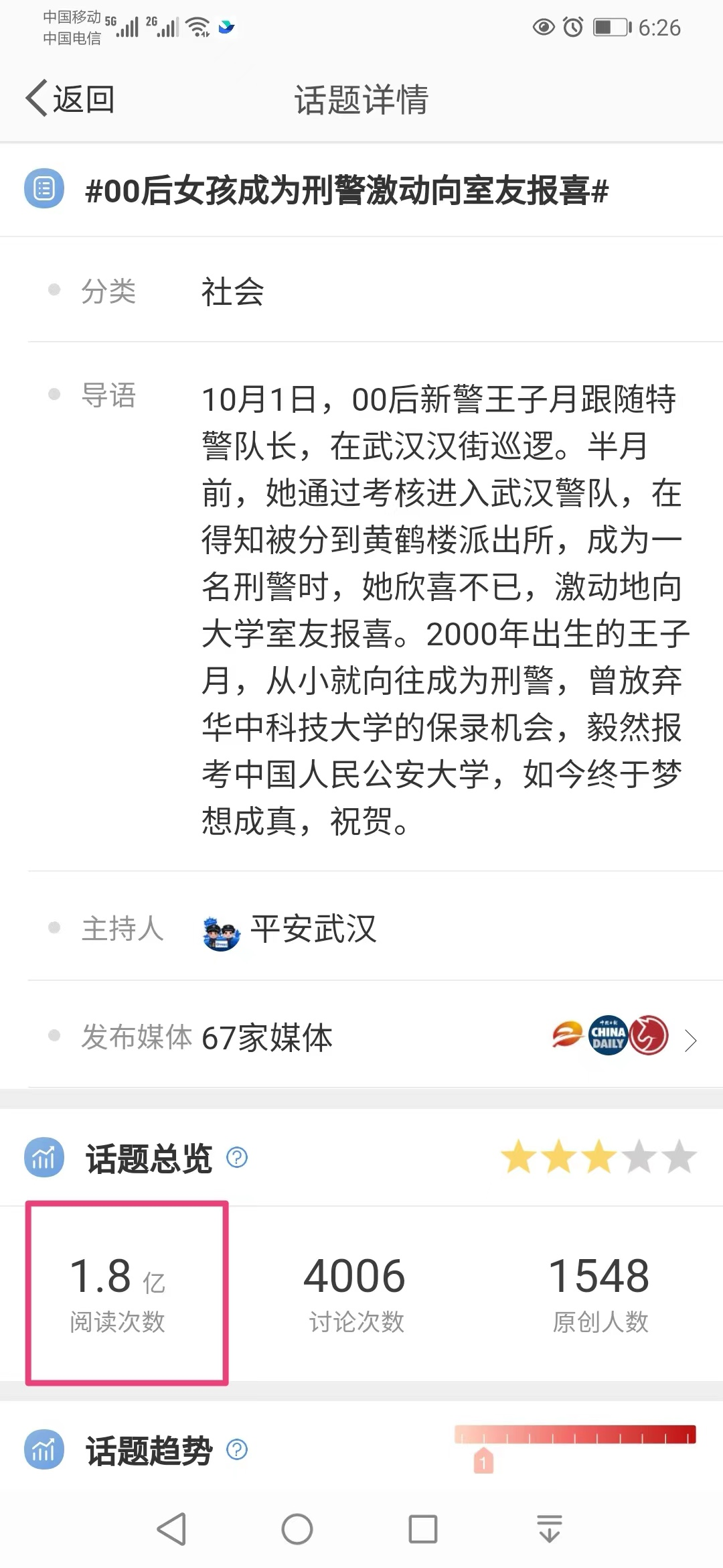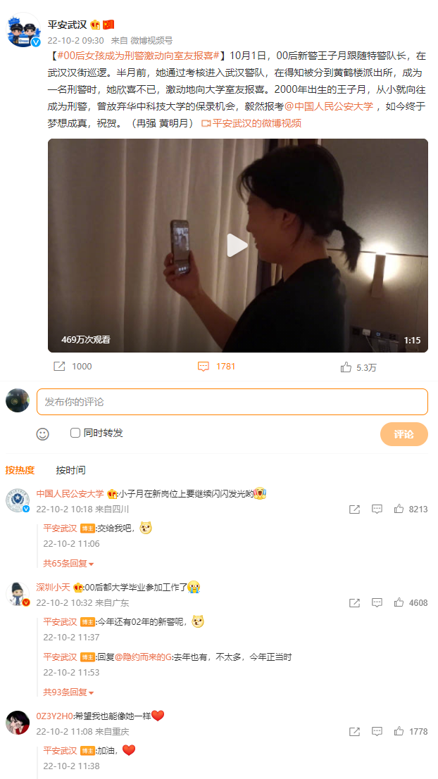 王子月: 空降热搜,在激动之后更多的是诚惶诚恐。我很庆幸,自己的选择和坚持能够燃起许多网友对梦想的追求。艰巨在于漫长,光荣在于平淡。我深知,自己现在享受到的正向曝光和关注,都是无数公安前辈们努力奋斗取得的,是他们的荣光汇集到了我这个00后新警后辈上。同时我也从网友们的鼓励中深深地感受到人民群众对我们公安民警的尊重和认可。视频中的成绩都已留在了过去,现在的我只是一个刚刚参加工作的新警。本着“空杯”的心态,我会从头开始摸索、学习,坚持自己的热爱,时刻提醒自己不忘来时之路,让这份已经坚持了很久的热情一直延续下去。